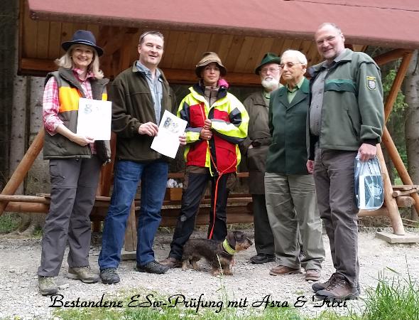Unsere beiden Hündinnen Trixi und Asra und eine Hündin der Züchterin Grit Leeder wurden zur ESw-Prüfung vorgestellt. Alle drei Hunde haben die ESw-Eignung zur Stöberjagd am Schwarzwild bestanden.